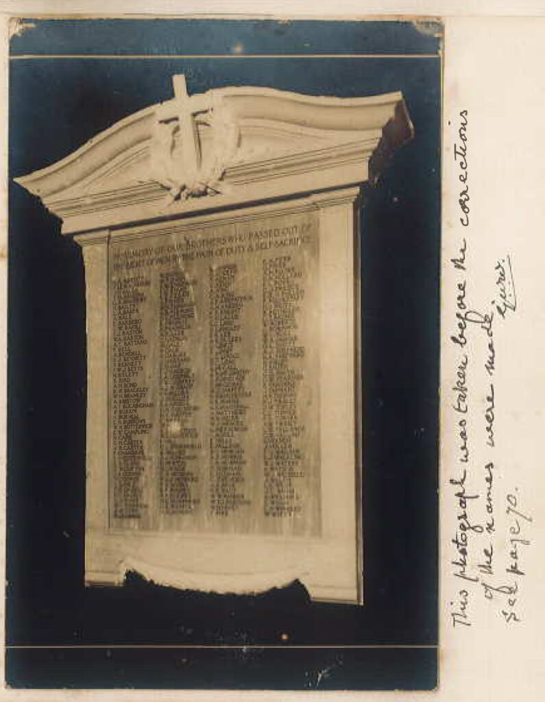 In 1919 a committee was formed with the resolution to erect a Marble Tablet in the Parish Churchof St Mary with St Gabriel, Newington, in memory of those who had fallen in the War. The memorial was to be for all in the Ecclesiastical Parish who have fallen and for those not resident in the Parish whose names were submitted and approved by the parish authority set up for the purpose. The Young Men’s Clubs were to be permitted to go with their work for separate memorials. The names were to be recorded on a marble tablet and also in a book, kept in the church but sadly when the church was bombed during the Blitz the memorial was destroyed with the church. The original idea to have a book of the dead was not fulfilled due to financial constraints but a minute book of the committee with all the names can still be consulted at the church by arrangement with the Rector.